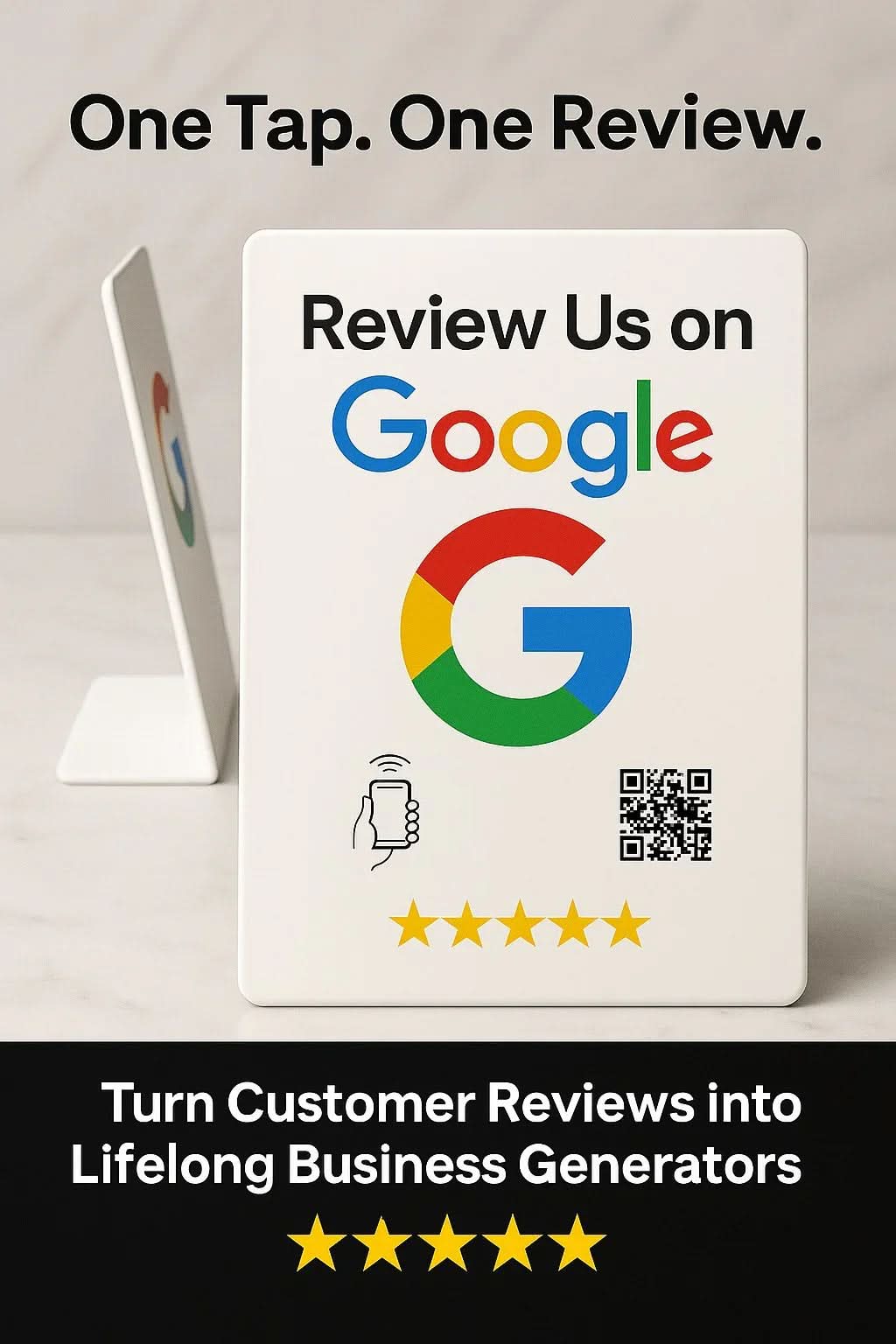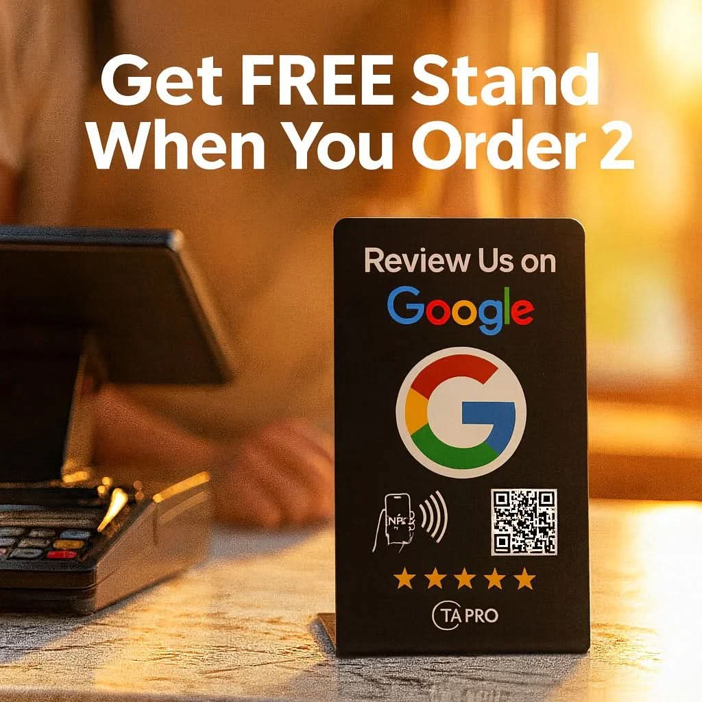 Transform your business with the NFC Google Review Stand from TAPro—the ultimate tool for instant 5-star reviews. Available in 7 vibrant colors and 13 stunning designs, our stands feature premium NTAG215 NFC and QR technology for seamless feedback. Crafted with durable, waterproof materials, TAPro stands require no apps or subscriptions. Tap or scan to boost your Google Business Profile, elevate local SEO, and drive sales in cities like New York, Miami, and Los Angeles.